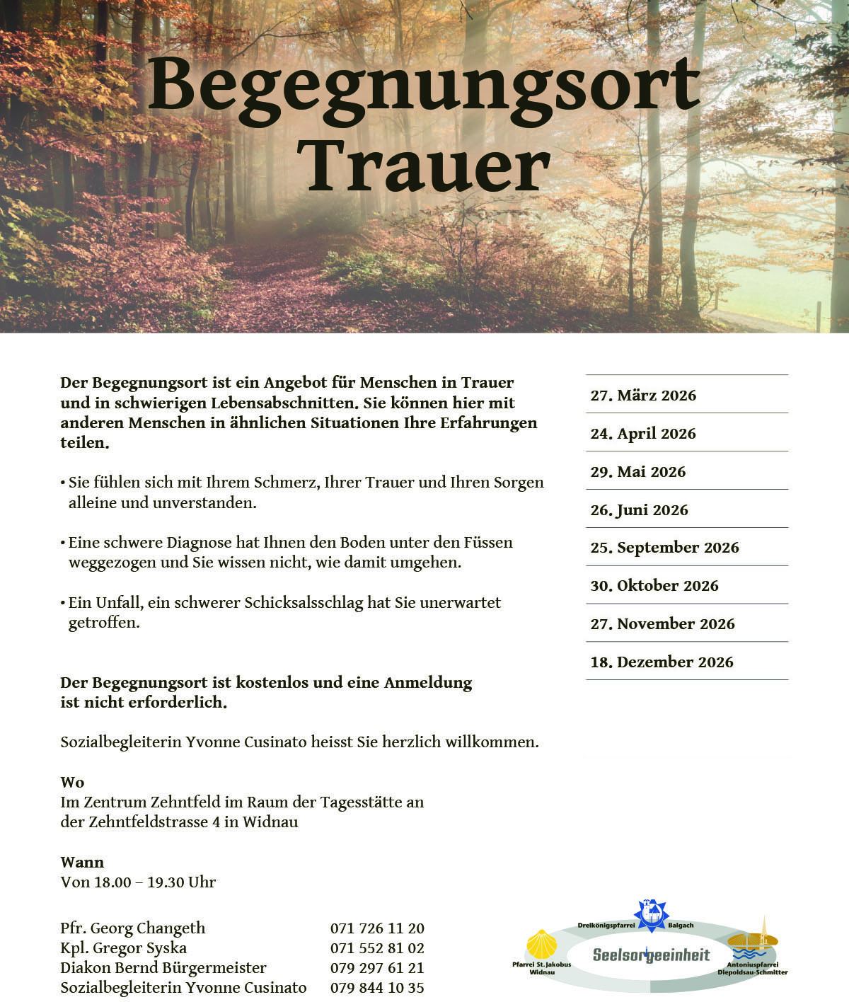 Der Begegnungsort Trauer auch bekannt unter Trauerkaffee ist ein Angebot für Menschen jeden Alters, die sich in Trauer oder in schwierigen Lebensabschnitten befinden. Sie können hier mit Menschen in ähnlichen Situationen ihre Gefühle und Erfahrungen austauschen.